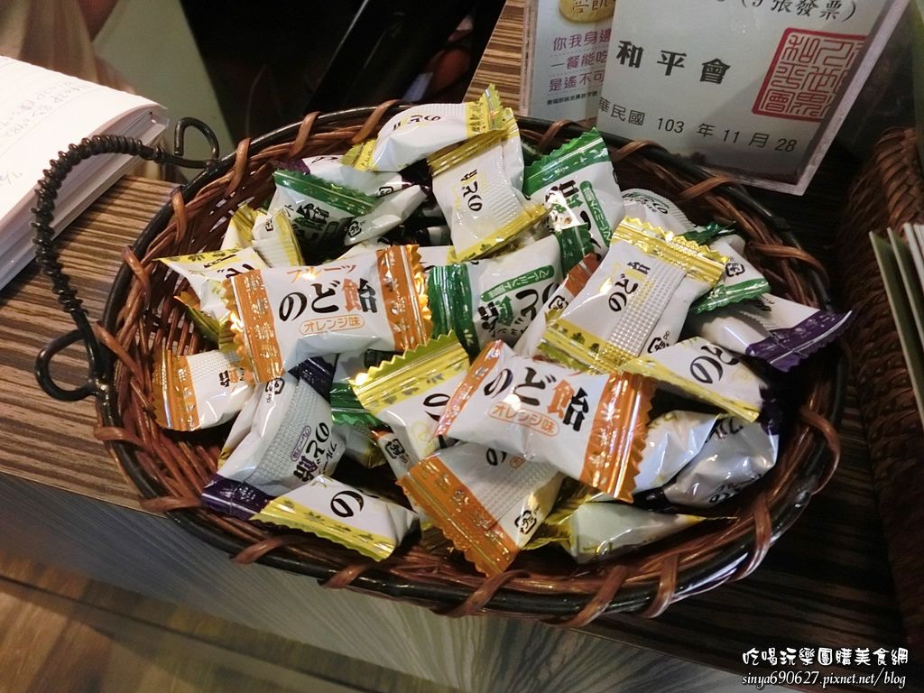▲『恆八味屋日式火鍋專賣店』跟豬排店一樣擺放著日本進口的薄荷、橘子、檸檬、葡萄四種口味的涼糖,想吃都可以隨意取用!