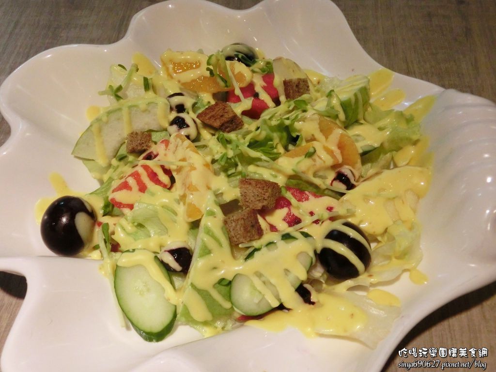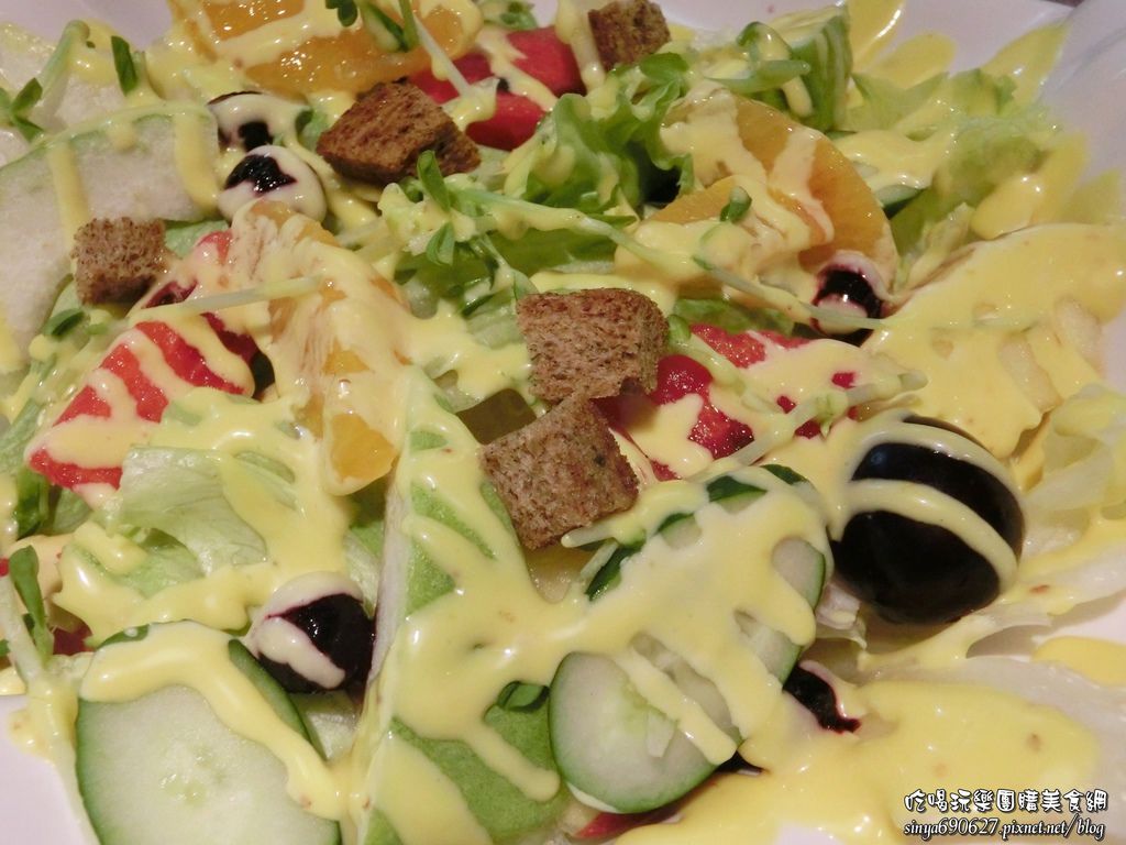 再淋上芒果優格醬,微酸香甜的醬汁搭配沙拉一起吃超美味可口,吃起來清爽可口,也非常開胃,沙拉的表現很不錯!