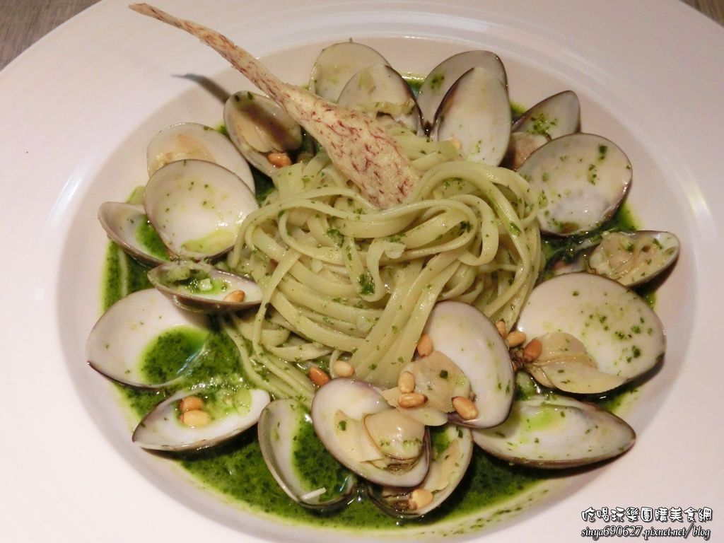 ▲『心滿藝筑 X Incontra』主廚以九層塔特調青醬,搭配嚴選水產合格特大級蛤礪及松子,