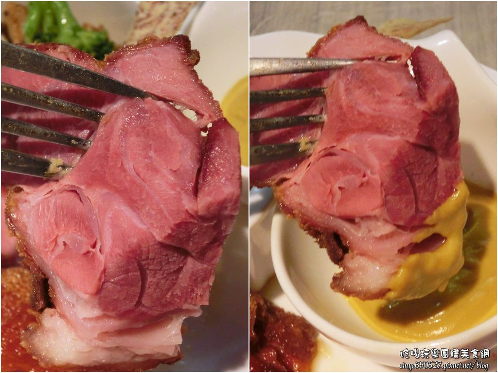 看了好餓喔!豬腳的外皮烤到非常酥脆,吃起來肉汁四溢、肉質飽滿紮實很有嚼勁,搭配特製蜂蜜芥末醬更加香醇美味!