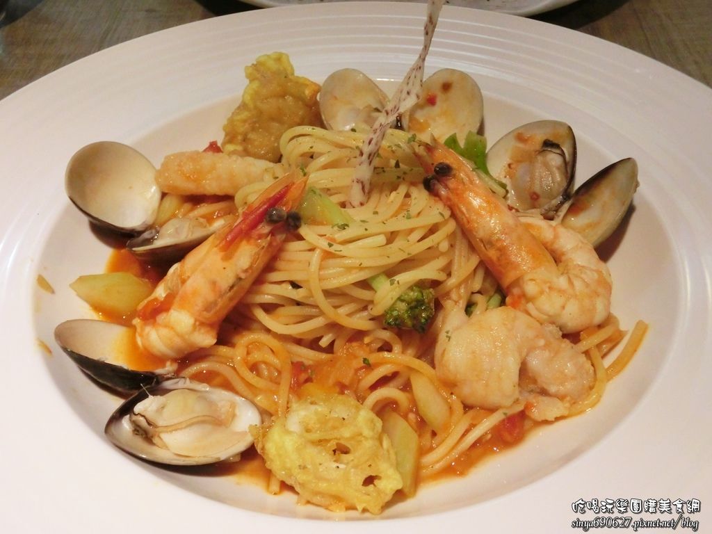 ▲『心滿藝筑 X Incontra』這道義大利麵為店家的人氣商品之一,滿滿的配料有蛤蠣、鮮蝦、花枝圈...等,